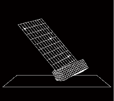 While you view the deformation history of the drop test, take note of when the foam is in contact with the floor. You should observe that the initial impact occurs over the first 4 ms of the analysis. A second impact occurs from about 8 ms to 15 ms. The deformed state of the foam and board at approximately 4 ms after impact is shown in Figure 1.