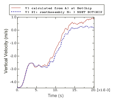 Next, we will evaluate the plausibility of the acceleration data recorded at the bottom chip. To do this, we will integrate the acceleration data to calculate the chip velocity and displacement and compare the results to the velocity and displacement data recorded directly by Abaqus/Explicit.