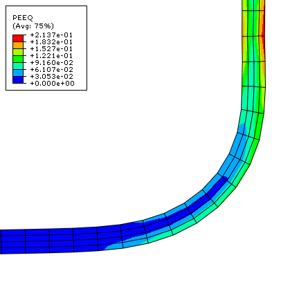 Figure 2. Contours of the scalar plastic strain variable PEEQ in one corner of the blank.