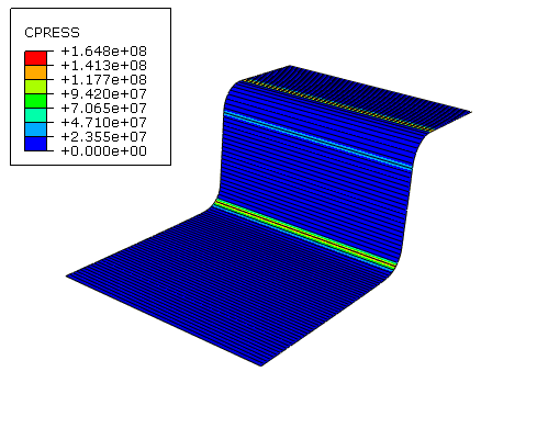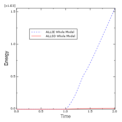 It is important to verify that the presence of contact stabilization does not significantly alter the physics of the problem. One way to assess this requirement is to compare the energy dissipation due to stabilization (ALLSD) against the internal energy of the structure (ALLIE). Ideally the amount of stabilization energy should be a small fraction of the internal energy. Figure 4 shows the variation of the stabilization and internal energies. It is clear that the dissipated stabilization energy is indeed small.