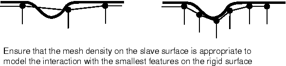 The deformable mesh must be refined enough to interact with any feature on the rigid surface. There is no point in having a 10 mm wide feature on the rigid surface if the deformable elements that will contact it are 20 mm across: the rigid feature will just penetrate into the deformable surface as shown in Figure 2.