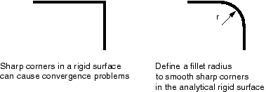 The contact algorithm in Abaqus/Standard requires the master surface of a contact interaction to be smooth. Rigid surfaces are always the master surface and so should always be smoothed. Abaqus/Standard does not smooth discrete rigid surfaces. The level of refinement controls the smoothness of a discrete rigid surface. Analytical rigid surfaces can be smoothed by defining a fillet radius that is used to smooth any sharp corners in the rigid surface definition (see Figure 3.)