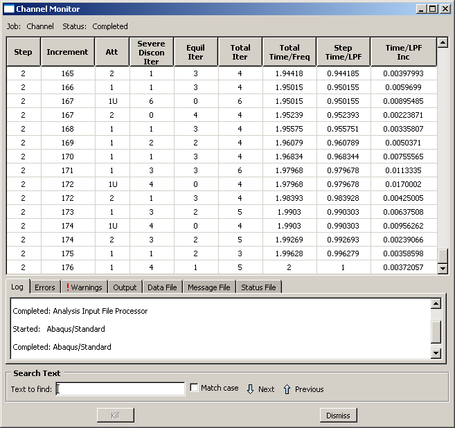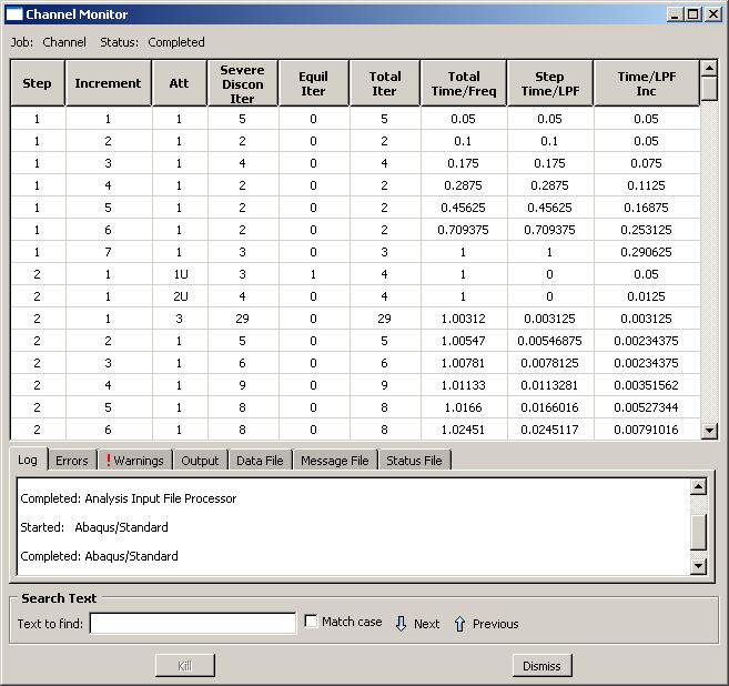 ![]() The value of the punch displacement appears in the Output tabbed page. This simulation contains many severe discontinuity iterations. Abaqus/Standard has a difficult time determining the contact state in the first increment of Step 2. It needs three attempts before it finds the proper configuration of the PunchSurf and BlankTop surfaces and achieves equilibrium. After this difficult start, Abaqus/Standard quickly increases the increment size to a more reasonable value. The end of the Job Monitor is shown in Figure 2. Figure 2. Bottom of the Job Monitor: channel forming analysis.