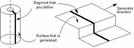 Analytical rigid surfaces have three basic forms. In two dimensions the specific form of an analytical rigid surface is a two-dimensional, segmented rigid surface. The cross-section of the surface is defined in the two-dimensional plane of the model using straight lines, circular arcs, and parabolic arcs. The cross-section of a three-dimensional rigid surface is defined in a user-specified plane in the same manner used for two-dimensional surfaces. Then, this cross-section is swept around an axis to form a surface of revolution or extruded along a vector to form a long three-dimensional surface as shown in Figure 3.