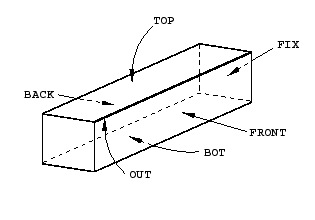 Create the geometry sets TOP, BOT, FRONT, BACK, FIX, and OUT as shown in Figure 1. (The set OUT contains the edge shown in bold in Figure 1.) Create the surface named LOAD shown in Figure 2. These regions will be used later for the application of loads and boundary conditions, as well as for the definition of output requests. Figure 1. Sets.