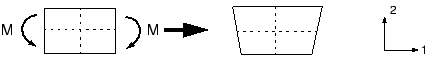Linear reduced-integration elements tend to be too flexible because they suffer from their own numerical problem called hourglassing. Again, consider a single reduced-integration element modeling a small piece of material subjected to pure bending (see Figure 2). Figure 2. Deformation of a linear element with reduced integration subjected to bending moment M.
