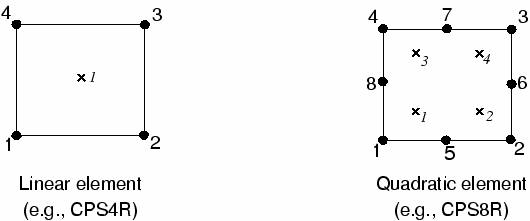 Reduced-integration elements use one fewer integration point in each direction than the fully integrated elements. Reduced-integration, linear elements have just a single integration point located at the element's centroid. (Actually, these first-order elements in Abaqus use the more accurate “uniform strain” formulation, where average values of the strain components are computed for the element. This distinction is not important for this discussion.) The locations of the integration points for reduced-integration, quadrilateral elements are shown in Figure 1. Figure 1. Integration points in two-dimensional elements with reduced integration.