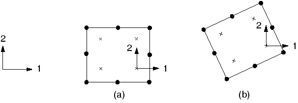 By default, element output variables such as stress and strain refer to the global Cartesian coordinate system. Thus, the -component of stress at the integration point shown in Figure 3(a) acts in the global 1-direction. Even if the element rotates during a large-displacement simulation, as shown in Figure 3(b), the default is still to use the global Cartesian system as the basis for defining the element variables.