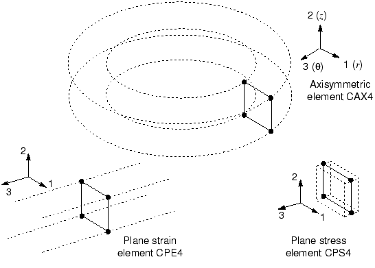 Abaqus has several classes of two-dimensional continuum elements that differ from each other in their out-of-plane behavior. Two-dimensional elements can be quadrilateral or triangular. Figure 1 shows the three classes that are used most commonly.