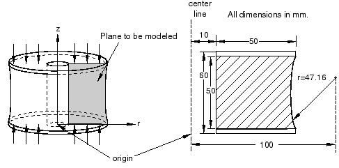 ![]() You can use axisymmetric elements for this simulation since both the geometry of the structure and the loading are axisymmetric. Therefore, you only need to model a plane through the component: each element represents a complete 360° ring. You will examine the static response of the mount; therefore, you will use Abaqus/Standard for your analysis. |
