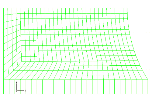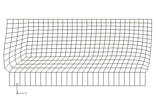 ![]() The issues surrounding the mesh distortion in the opposite corner are addressed in Techniques for reducing volumetric locking. The elements in the bottom left-hand corner region are now much more distorted in the initial, undeformed configuration. However, as the analysis progresses and the elements deform, their shape actually improves. The deformed shape plot, shown in Figure 2, illustrates that the amount of element distortion in this region is reduced; however, the level of mesh distortion in the bottom right-hand corner of the rubber model is still significant. Figure 2. Deformed shape of the modified mesh.