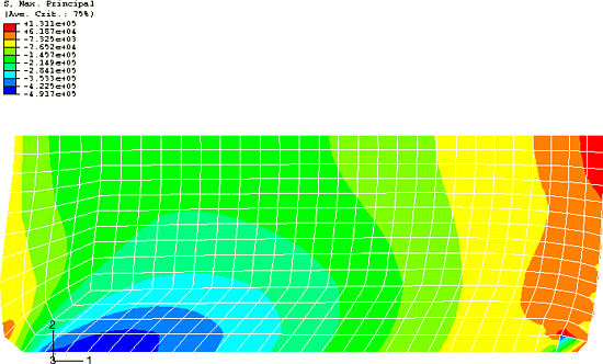 ![]() The contours of maximum principal stress (Figure 3) show that the very localized stress in that corner has been reduced only slightly. Figure 3. Contours of maximum principal stress in the modified mesh.