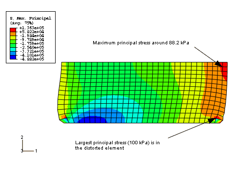 When you look at the integration point values, you will discover that the peak value of maximum principal stress occurs in one of the distorted elements in the bottom right-hand part of the model. This value is likely to be unreliable because of the levels of element distortion and volumetric locking. If this value is ignored, there is an area near the plane of symmetry where the maximum principal stress is around 88.2 kPa.