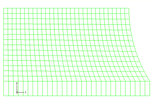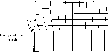 Some elements in this corner of the model are becoming badly distorted because the mesh design in this area was inadequate for the type of deformation that occurs there. Although the shape of the elements is fine at the start of the analysis, they become badly distorted as the rubber bulges outward, especially the element in the corner. If the loading were increased further, the element distortion may become so excessive that the analysis may abort. Mesh design for large distortions, discusses how to improve the mesh design for this problem.