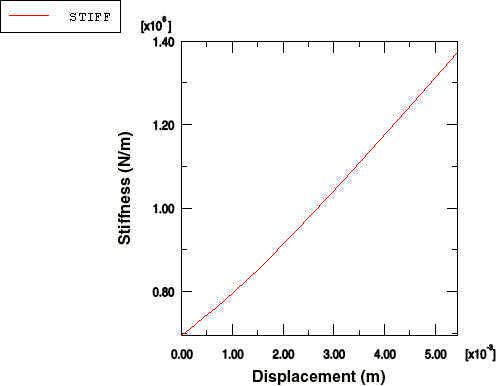 In the Results Tree, click mouse button 3 on STIFFNESS underneath the XYData container and select Plot from the menu that appears to view the plot in Figure 1 that shows the variation of the mount's axial stiffness as the mount deforms.