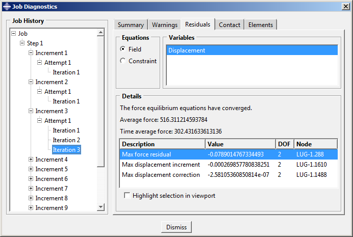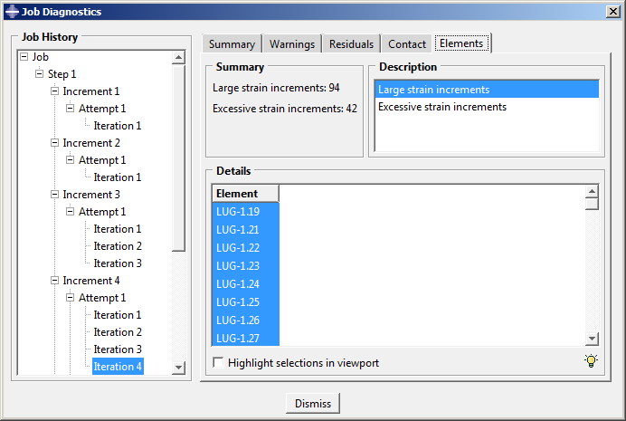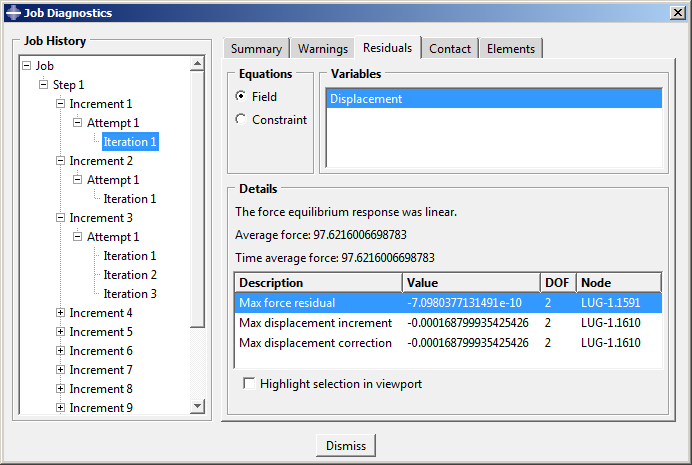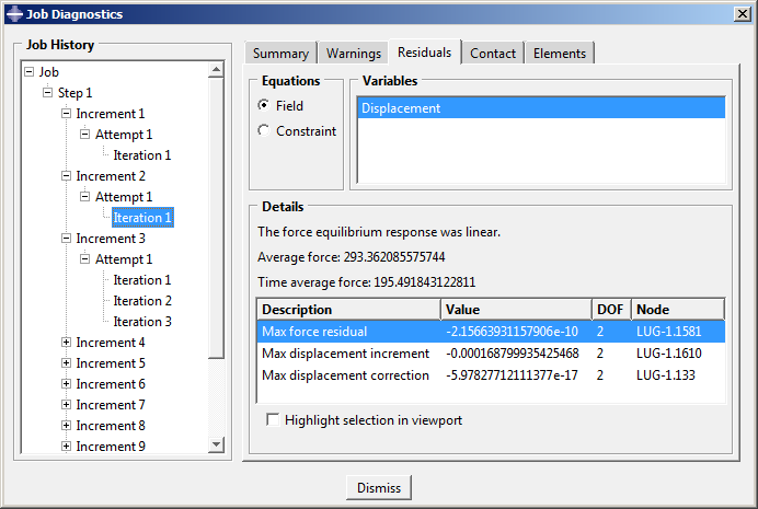 Enter the Visualization module, and open the file PlasticLugNoHard.odb. Open the Job Diagnostics dialog box to examine the convergence history of the job. Looking at the information for the first increment in the analysis (see Figure 4), you will discover that the model's initial behavior is determined to be linear.