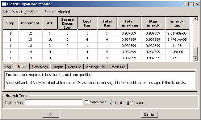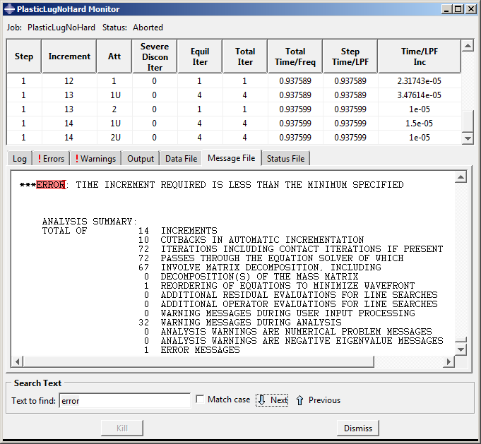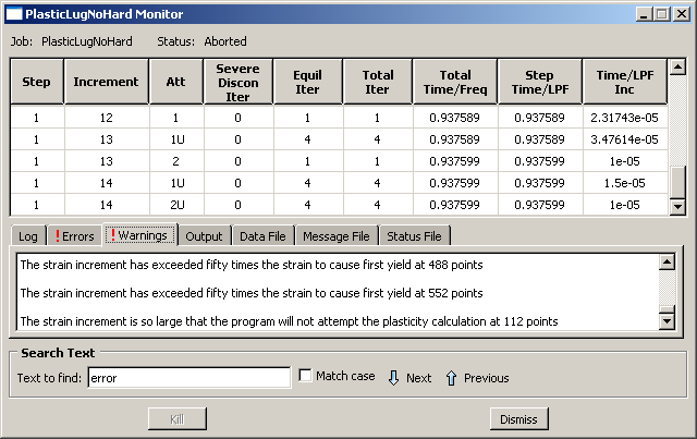 Abaqus/Standard was able to apply only 94% of the prescribed load to the model. The Job Monitor shows that Abaqus/Standard reduced the size of the time increment, shown in the last (right-hand) column, many times during the simulation and stopped the analysis in the fourteenth increment. The information on the Errors tabbed page (see Figure 1) indicates that the analysis terminated. Click the Message File tab to view the error details in the message file, as shown in Figure 2. The error indicates that the analysis terminated because the size of the time increment is smaller than the value allowed for this analysis. This is a classic symptom of convergence difficulties and is a direct result of the continued reduction in the time increment size. To begin diagnosing the problem, click the Warnings tab in the Job Monitor dialog box. As shown in Figure 3, many warning messages concerning large strain increments and problems with the plasticity calculations are found here. These warnings are related since problems with the plasticity calculations are typically the result of excessively large strain increments and often lead to divergence. Thus, we suspect that numerical problems with the plasticity calculations caused Abaqus/Standard to terminate the analysis early.