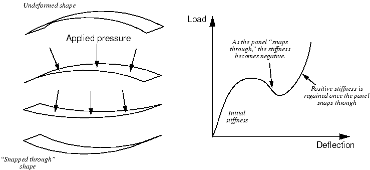 ![]() If the tip deflection is small, the analysis can be considered as being approximately linear. However, if the tip deflections are large, the shape of the structure and, hence, its stiffness changes. In addition, if the load does not remain perpendicular to the beam, the action of the load on the structure changes significantly. As the cantilever beam deflects, the load can be resolved into a component perpendicular to the beam and a component acting along the length of the beam. Both of these effects contribute to the nonlinear response of the cantilever beam (i.e., the changing of the beam's stiffness as the load it carries increases). One would expect large deflections and rotations to have a significant effect on the way that structures carry loads. However, displacements do not necessarily have to be large relative to the dimensions of the structure for geometric nonlinearity to be important. Consider the “snap through” under applied pressure of a large panel with a shallow curve, as shown in Figure 2. Figure 2. Snap-through of a large shallow panel.