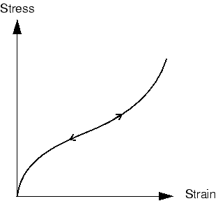 ![]() Rubber materials can be approximated by a nonlinear, reversible (elastic) response (see Figure 2). Figure 2. Stress-strain curve for a rubber-type material.