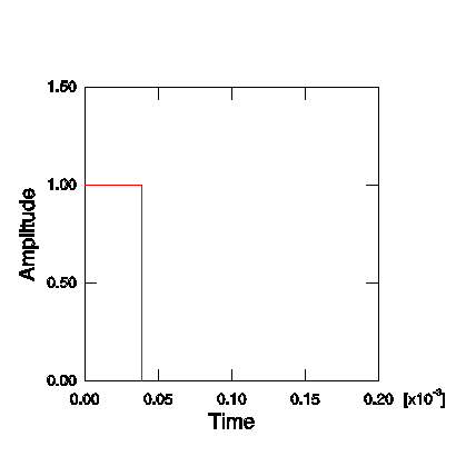 ![]() To make the problem a one-dimensional strain problem, all four lateral faces are on rollers; thus, the three-dimensional model simulates a one-dimensional problem. The material is steel with the properties shown in Figure 1. The free end of the bar is subjected to a blast load with a magnitude of 1.0 × 105 Pa and a duration of 3.88 × 10−5 s. The normalized load versus time is shown in Figure 2. Figure 2. Blast amplitude versus time.