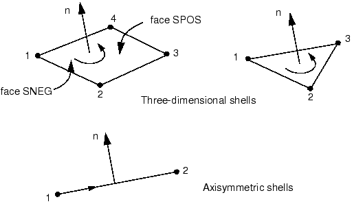 ![]() For axisymmetric shell elements the positive normal direction is defined by a 90° counterclockwise rotation from the direction going from node 1 to node 2. For three-dimensional shell elements the positive normal is given by the right-hand rule going around the nodes in the order in which they appear in the element definition. The “top” surface of a shell is the surface in the positive normal direction and is called the SPOS face for contact definition. The “bottom” surface is in the negative direction along the normal and is called the SNEG face for contact definition. Normals should be consistent among adjoining shell elements. The positive normal direction defines the convention for element-based pressure load application and output of quantities that vary through the shell thickness. A positive element-based pressure load applied to a shell element produces a load that acts in the direction of the positive normal. (The element-based pressure load convention for shell elements is opposite to that for continuum elements; the surface-based pressure load conventions for shell and continuum elements are identical. For more on the difference between element-based and surface-based distributed loads, see Distributed loads.) |