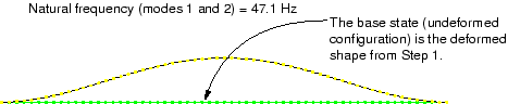 ![]() The natural frequency associated with each eigenmode is reported in the plot title. The lowest natural frequency of the pipe section when the 4 MN tensile load is applied is 47.1 Hz. The tensile loading has increased the stiffness of the pipe and, thus, increased the vibrational frequencies of the pipe section. This lowest natural frequency is within the frequency range of the harmonic loads; therefore, resonance of the pipe may be a problem when it is used with this loading. You, therefore, need to continue the simulation and apply additional tensile load to the pipe section until you find the magnitude that raises the natural frequency of the pipe section to an acceptable level. Rather than repeating the analysis and increasing the applied axial load, you can use the restart capability in Abaqus to continue the load history of a prior simulation in a new analysis. |
