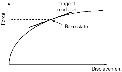 The starting point for a linear perturbation step is called the base state of the model. If the first step in a simulation is a linear perturbation step, the base state is the state of the model specified using initial conditions. Otherwise, the base state is the state of the simulation at the end of the last general step prior to the linear perturbation step. Although the response of the structure during the perturbation step is by definition linear, the model may have a nonlinear response in previous general steps. For models with a nonlinear response in the prior general steps, Abaqus/Standard uses the current elastic modulus as the linear stiffness for perturbation procedures. This modulus is the initial elastic modulus for elastic-plastic materials and the tangent modulus for hyperelastic materials (see Figure 1); the moduli used for other material models are described in General and perturbation procedures. Figure 1. For hyperelastic materials the tangent modulus is used as the