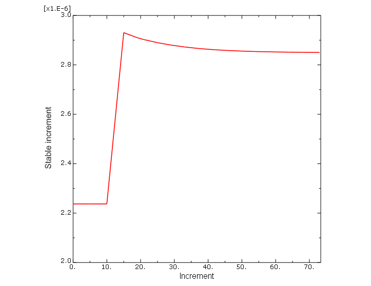 You can browse or search this file by clicking the Job Monitor. The status file contains information about moments of inertia, followed by information concerning the stability limit. The 10 elements with the lowest stable time limits are listed in rank order. tab in theMost critical elements: Element number Rank Time increment Increment ratio (Instance name) ---------------------------------------------------------- 1 1 2.237266E-06 1.000000E+00 BAR-1 10 2 2.237266E-06 1.000000E+00 BAR-1 21 3 2.237266E-06 1.000000E+00 BAR-1 30 4 2.237266E-06 1.000000E+00 BAR-1 31 5 2.237266E-06 1.000000E+00 BAR-1 40 6 2.237266E-06 1.000000E+00 BAR-1 51 7 2.237266E-06 1.000000E+00 BAR-1 60 8 2.237266E-06 1.000000E+00 BAR-1 61 9 2.237266E-06 1.000000E+00 BAR-1 70 10 2.237266E-06 1.000000E+00 BAR-1The status file continues with information about the progress of the solution. STEP 1 ORIGIN 0.0000 Total memory used for step 1 is approximately 6.8 megabytes. Global time estimation algorithm will be used. Scaling factor : 1.0000 Variable mass scaling factor at zero increment: 1.0000 STEP TOTAL CPU STABLE CRITICAL KINETIC TOTAL INCREMENT TIME TIME TIME INCREMENT ELEMENT ENERGY ENERGY 0 0.000E+00 0.000E+00 00:00:00 2.237E-06 70 0.000E+00 0.000E+00 INSTANCE WITH CRITICAL ELEMENT: BAR-1 ODB Field Frame Number 0 of 4 requested intervals at increment zero. 5 1.119E-05 1.119E-05 00:00:00 2.237E-06 70 4.504E-05 -1.963E-06 10 2.237E-05 2.237E-05 00:00:00 2.237E-06 2010 9.189E-05 -2.218E-06 15 3.471E-05 3.471E-05 00:00:00 2.931E-06 2090 1.434E-04 -2.361E-06 19 4.640E-05 4.640E-05 00:00:00 2.910E-06 1040 1.607E-04 1.850E-06 21 5.221E-05 5.221E-05 00:00:00 2.902E-06 600 1.588E-04 2.585E-06 ODB Field Frame Number 1 of 4 requested intervals at 5.176230E-05 25 6.380E-05 6.380E-05 00:00:00 2.890E-06 590 1.569E-04 6.082E-07 29 7.535E-05 7.535E-05 00:00:00 2.880E-06 4640 1.553E-04 -7.049E-07 33 8.685E-05 8.685E-05 00:00:00 2.873E-06 4670 1.537E-04 -1.386E-06 Similar information is available in the Job Diagnostics dialog box of the Visualization module. This dialog box also allows you to plot histories of the data, as shown in Figure 1. To create a history plot, select a step from the Job History, select a column in the Incrementation tab, and click . Figure 1. Stable time increment history.