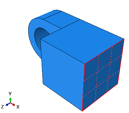 In the viewport, select the face at the end of the solid hinge piece as the surface to which the load will be applied, as shown by the gridded surface in Figure 1. Figure 1. Apply a load to the solid hinge piece.