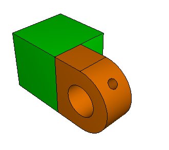 Abaqus/CAE displays the hinge piece with the lubrication hole. The cube portion of the hinge piece is colored green to indicate that it can be meshed using the structured meshing technique; the flange with the lubrication hole is colored orange to indicate that it needs to be partitioned to be meshed using hexahedral elements, as shown in Figure 2. The partitioning procedure is described in Partitioning the flange with the lubrication hole.