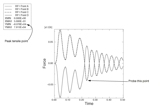 Plot multiple curvesPosition the gridPosition the legendQuery the X–Y plotContext: At the attachment points at the top of each truss structure, the peak tensile force is around 80 kN, which is below the 100 kN capacity of the connection. Keep in mind that a negative reaction force in the 1-direction means that the member is being pulled away from the wall. The lower attachments are in compression (positive reaction force) while the load is applied but oscillate between tension and compression after the load has been removed. The peak tensile force is about 40 kN, well below the allowable value. To find this value, probe the X–Y plot. |