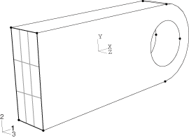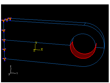 ![]() The lug carries a pressure of 50 MPa distributed around the bottom half of the hole. To apply the load correctly, however, the part must first be partitioned (i.e., divided) so that the hole is composed of two regions: a top half and a bottom half. You use the Partition toolset to divide a part or assembly into regions. Partitioning is used for many reasons; it is commonly used for the purposes of defining material boundaries, indicating the location of loads and constraints (as in this example), and refining the mesh. An example of the use of partitioning for meshing purposes is discussed in the next section. For more information on partitioning, see The Partition toolset. Dependent part instances cannot be modified at the assembly level (e.g., they cannot be partitioned in an assembly-level module). The reason for this restriction is that all dependent instances of a part must have identical geometry so they can share the same mesh topology as the original part. Thus, any change to a dependent part instance has to be made to the original part itself (i.e., at the part level). In contrast, independent part instances may be partitioned at the assembly level. In this example a dependent part instance (the default) was created; the corresponding partitioning instructions follow. Prescribe boundary conditionsPartition a dependent part instanceApply a pressure load |