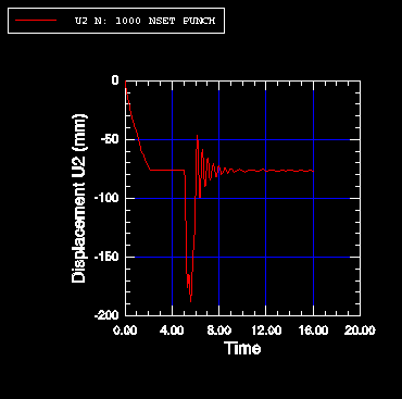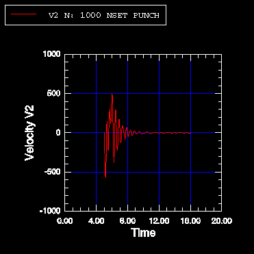 Create a similar X–Y plot of vertical velocity (V2) versus time. You cannot select velocity during the first step because the first step was not a dynamic step; Abaqus/Standard computed velocity and acceleration only during the second and third steps. Use the same X-axis range as before, and use a Y-axis range from 1000 to −1000. Label the Y-axis Velocity V2. The finished plot is shown in Figure 2. Figure 2. Customized X–Y plot of velocity.