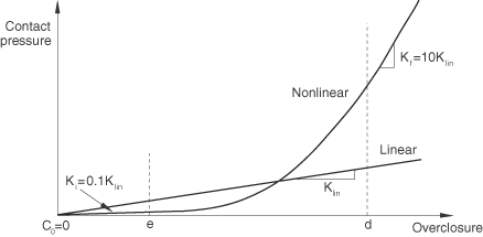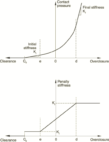 Choosing a penalty methodAbaqus/Standard offers linear and nonlinear variations of the penalty method. With the linear penalty method the so-called penalty stiffness is constant, so the pressure-overclosure relationship is linear. With the nonlinear penalty method the penalty stiffness increases linearly between regions of constant low initial stiffness and constant high final stiffness, resulting in a nonlinear pressure-overclosure relationship. The default penalty method is linear. A comparison of the linear and nonlinear pressure-overclosure relationships with the default settings is shown in Figure 1. Figure 1. Comparison of linear and nonlinear pressure-overclosure relationships
