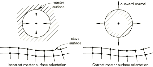 The following output from a data check analysis (see Abaqus/Standard and Abaqus/Explicit execution) can be useful in identifying incorrectly oriented master surfaces: