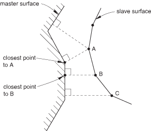 ProductsAbaqus/StandardAbaqus/CAE Formulations for general contactGeneral contact in Abaqus/Standard always uses the finite-sliding, surface-to-surface contact formulation. This formulation can also be used for contact pairs, but it is not the default. The discussions in this section of finite-sliding, surface-to-surface contact apply equally to general contact and to contact pairs. In a general contact domain the master and slave roles are assigned to surfaces automatically, although it is possible to override these default assignments. The behavior of master surfaces and slave surfaces is consistent across general contact and contact pair interactions. The specification of master and slave surfaces in a general contact domain is covered in detail in Numerical controls for general contact in Abaqus/Standard. Discretization of contact pair surfacesAbaqus/Standard applies conditional constraints at various locations on interacting surfaces to simulate contact conditions. The locations and conditions of these constraints depend on the contact discretization used in the overall contact formulation. Abaqus/Standard offers two contact discretization options: a traditional “node-to-surface” discretization and a true “surface-to-surface” discretization. Node-to-surface contact discretizationWith traditional node-to-surface discretization the contact conditions are established such that each “slave” node on one side of a contact interface effectively interacts with a point of projection on the “master” surface on the opposite side of the contact interface (see Figure 1). Thus, each contact condition involves a single slave node and a group of nearby master nodes from which values are interpolated to the projection point. Figure 1. Node-to-surface contact discretization.