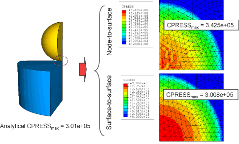Choosing a contact discretizationIn general, surface-to-surface discretization provides more accurate stress and pressure results than node-to-surface discretization if the surface geometry is reasonably well represented by the contact surfaces. Figure 3 shows an example of improved contact pressure accuracy with surface-to-surface contact compared to node-to-surface contact. Figure 3. Comparison of contact pressure accuracy for node-to-surface and