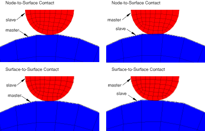 The surface-to-surface formulation is primarily intended for common situations in which normal directions of contacting surfaces are approximately opposite. The node-to-surface contact formulation is often preferable for treating contact involving feature edges or corners if the respective slave and master facet normal directions are not approximately opposite in the active contact region. Contact tracking approachesIn Abaqus/Standard there are two tracking approaches to account for the relative motion of two interacting surfaces in mechanical contact simulations. The finite-sliding tracking approachFinite-sliding contact is the most general tracking approach and allows for arbitrary relative separation, sliding, and rotation of the contacting surfaces. For finite-sliding contact the connectivity of the currently active contact constraints changes upon relative tangential motion of the contacting surfaces. For a detailed description of how Abaqus/Standard calculates finite-sliding contact, see Using the finite-sliding tracking approach later in this section. The small-sliding tracking approachSmall-sliding contact assumes that there will be relatively little sliding of one surface along the other and is based on linearized approximations of the master surface per constraint. The groups of nodes involved with individual contact constraints are fixed throughout the analysis for small-sliding contact, although the active/inactive status of these constraints typically can change during the analysis. You should consider using small-sliding contact when the approximations are reasonable, due to computational savings and added robustness. For a detailed description of how Abaqus/Standard calculates small-sliding contact, see Using the small-sliding tracking approach later in this section. Choosing the master and slave roles in a two-surface contact pairAbaqus/Standard enforces the following rules related to the assignment of the master and slave roles for contact surfaces: