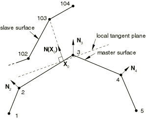 ![]() The algorithm used to define anchor points is described below. If an anchor point cannot be determined for a particular slave node, no contact constraint will be enforced for that slave node. Having a local tangent plane for each slave node means that for the small-sliding tracking approach Abaqus/Standard does not have to monitor slave nodes for possible contact along the entire master surface. Therefore, small-sliding contact is generally less expensive computationally than finite-sliding contact. The cost savings are often most dramatic in three-dimensional contact problems. Small-sliding, node-to-surface contactFor node-to-surface contact Abaqus/Standard chooses the anchor point of a slave node's local tangent plane such that the vector from the anchor point to the slave node coincides with a smoothly varying normal vector on the master surface. The anchor point is chosen before the analysis starts using the initial configuration of the model. Smoothly varying master surface normalsThe algorithm requires that the master surface have a smoothly varying normal vector , where is any point on the master surface. The first step in defining is to construct the unit normal vectors at each node of the master surface. Abaqus/Standard forms these nodal normals by averaging the normals of the element faces making up the master surface; only the element faces in the surface definition will contribute to the nodal normals and, thus, to . Abaqus/Standard uses the initial nodal coordinates to compute these normals. Figure 11 shows the nodal unit normals for a master surface, the anchor point , and the local tangent plane associated with slave node 103. Abaqus/Standard uses the nodal unit normals and , along with the shape functions of the element containing the two nodes, to construct on the 2–3 element face. Abaqus/Standard chooses the anchor point of the local tangent plane for node 103 so that passes through node 103. is the contact direction for slave node 103 and defines the orientation of the local tangent plane. In this example, as in many cases, the local tangent plane is only an approximation of the actual mesh geometry. Modifying the master surface normalsDefining user-specified nodal normals on the master surface (see Normal definitions at nodes) will improve the local tangent planes calculated for the small-sliding, node-to-surface formulation in some cases. For example, a default nodal normal corresponding to an average normal among adjacent facets can cause significant deviation from the true surface normal direction at perimeter nodes, as shown in Figure 12. The nodal normal does not point along the symmetry plane, which means that slave node 100 will never intersect the master surface. In a small-sliding problem if a slave node fails to intersect the master surface at the start of the analysis, it will be free to penetrate the master surface because no local tangent plane will be formed. Figure 12. Master surface normal at node 1 in a small-sliding model of