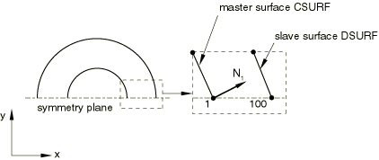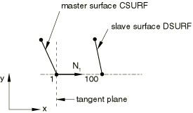 ![]() Defining a user-specified normal (1.00E+00, 0.00E+00, 0.00E+00) at node 1 on the master surface CSURF will correct the problem, as shown in Figure 13. This method allows slave node 100 to see the master surface, and the correct contact normal direction will be used. Master surface normals at perimeter nodes are adjusted automatically to lie along the symmetry plane if boundary conditions are specified at these nodes in symmetry “type” format (XSYMM, YSYMM, or ZSYMM—see Boundary conditions in Abaqus/Standard and Abaqus/Explicit). Figure 13. The modified master surface normal at node 1 of