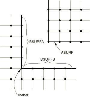 ![]() Input File Usage Use the following option for node-to-surface contact simulations: CONTACT PAIR, INTERACTION=interaction_property_name, SMOOTH=f Use the following option when using slide lines and contact elements: SLIDE LINE, ELSET=name, SMOOTH=f Abaqus/CAE Usage Interaction module: Surface-to-surface contact (Standard) or Self-contact (Standard): Degree of smoothing for master surface: f: Smoothing a deformable master surface along symmetry edgesWhen a two-dimensional or axisymmetric deformable master surface ends at a symmetry plane and node-to-surface discretization is used, Abaqus/Standard will smooth and calculate the proper surface normals and tangent planes of the end segment if the boundary condition at the symmetry end is specified with the symmetry “type” boundary XSYMM or YSYMM. This smoothing procedure is accomplished by reflecting the end segment about the symmetry plane and constructing either a parabolic or a cubic segment between the end segment and the reflected segment. Thus, the contact surface may differ from the faceted element geometry near the end. Abaqus/Standard will automatically adjust the surface normal and tangent planes at of an axisymmetric master surface regardless of whether a symmetry boundary condition is defined. The finite-sliding, surface-to-surface formulation has no special treatment for surfaces ending at a symmetry plane. See Modifying the master surface normals for a discussion of how the small-sliding, node-to-surface formulation treats master surfaces ending at a symmetry plane. See Small-sliding, surface-to-surface contact for a discussion of how the small-sliding, node-to-surface formulation treats slave surfaces ending at a symmetry plane. Overriding the default smoothing behavior for finite-sliding, node-to-surface contactTo model a master surface with corners in two dimensions (fold lines in three dimensions), break the surface into multiple surfaces. This technique prevents Abaqus/Standard from smoothing out the corners or fold lines and allows Abaqus/Standard to introduce constraints associated with each surface if a slave node is in contact with an interior corner or fold in the master surface. To accurately model the master surface with a corner shown in Figure 10, you must define two contact pairs: the first contact pair has ASURF as the slave surface and BSURFA as the master surface; the second contact pair has ASURF as the slave surface and BSURFB as the master surface. Figure 10. Master surface with a corner.