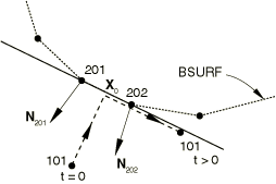 For constraints based on surface-to-surface discretization it is not necessary that the constraint associated with a node on a symmetry plane is parallel to the symmetry plane. Hence, there is usually no need to specify specific normal directions. As in the case of node-to-surface contact, the contact direction points from the anchor point to the slave node, and the tangent plane is normal to this direction. The contact normal for the small-sliding, surface-to-surface formulation is adjusted automatically to lie along the symmetry plane for each slave node that has a boundary condition specified in symmetry “type” format (XSYMM, YSYMM, or ZSYMM—see Boundary conditions in Abaqus/Standard and Abaqus/Explicit). Orientation of local tangent planesThe local tangent plane is by definition orthogonal to the contact direction. You can override the default contact direction to specify a direction with a spatially varying clearance or overclosure definition (see Specifying the surface normal for the contact calculations). Once the contact direction is defined, the orientation of the local tangent plane with respect to the master surface facet remains fixed. Because small-sliding contact considers nonlinear geometric effects, Abaqus/Standard continuously updates the orientation of the local tangent plane to account for the rotation and, assuming that the master surface is deformable, the deformation of the master surface. The position of the anchor point relative to the surrounding nodes on the master surface facet does not change as the master surface deforms. Load transferIn a small-sliding analysis each constraint can transfer load only to a limited number of nodes on the master surface. These nodes on the master surface are chosen based on their initial proximity to the anchor point. The magnitude of load transferred to each master surface node is based on proximity in the current, deformed configuration to the center-of-action on the slave surface (which corresponds to a slave node for the node-to-surface formulation). For example, in Figure 11 node 103 transmits load to both nodes 2 and 3 on the master surface if node-to-surface discretization is used (if surface-to-surface discretization is used, load may be transmitted to additional nearby master nodes). Thus, if node 103 contacts the local tangent plane, a larger share of the force would be transmitted to the master surface node, 2 or 3, closer to the slave node. When the anchor point corresponds to a node on the master surface, as is the case with slave node 104 and master surface node 3 in Figure 11, the transmitted load for node-to-surface contact is shared by the node at and all of the master surface nodes that share an adjacent surface facet with that node (additional master nodes may take part in the load transfer for surface-to-surface contact). In Figure 11 the three master surface nodes sharing the force transmitted by slave node 104 are nodes 2, 3, and 4. As the center-of-action on the slave surface for a constraint slides along its local tangent plane, Abaqus/Standard updates the distribution among the master surface nodes. However, no additional master surface nodes are ever added to the original list of nodes associated with a given small-sliding constraint. The constraint will continue to transmit load to the original list of master surface nodes, regardless of the sliding distance. Figure 14 shows the potential problem that arises if small sliding is used but the relative tangential motion of the surfaces is not “small.” It shows the possible evolution of contact between slave node 101 in Figure 5 and its master surface BSURF. Using the unit normal vectors and , the anchor point is found for slave node 101; for the purposes of this example, assume that it lies at the midpoint of the 201–202 face. With this location of the local tangent plane for node 101 is parallel with the 201–202 face. The load transfer always occurs between node 101 and nodes 201 and 202, no matter how far node 101 slides along the local tangent plane. Therefore, if node 101 moves as shown in Figure 14, it will continue to transmit load to nodes 201 and 202 when, in fact, it really slid off the mesh forming the master surface BSURF. Figure 14. Excessive sliding in a small-sliding contact analysis.