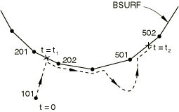 ![]() In this example slave node 101 may come into contact anywhere along the master surface BSURF. While in contact, it is constrained to slide along BSURF, irrespective of the orientation and deformation of this surface. This behavior is possible because Abaqus/Standard tracks the position of node 101 relative to the master surface BSURF as the bodies deform. Figure 6 shows the possible evolution of the contact between node 101 and its master surface BSURF. Figure 6. Trajectory of node 101 in finite-sliding contact.