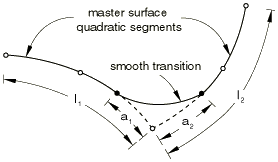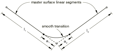 Input File Usage Use the following option to specify use of the state-based tracking algorithm: CONTACT PAIR, INTERACTION=interaction_property_name, TYPE=SURFACE TO SURFACE, TRACKING=STATE Abaqus/CAE Usage Interaction module: surface-to-surface contact or self-contact interaction editor: Discretization method: Surface to surface, Contact tracking: Single configuration (state) Smoothing master surfaces for the finite-sliding, node-to-surface formulationThe finite-sliding, node-to-surface contact formulation requires that master surfaces have continuous surface normals at all points. Convergence problems can result if master surfaces that do not have continuous surface normals are used in finite-sliding, node-to-surface contact analyses; slave nodes tend to get “stuck” at points where the master surface normals are discontinuous. Abaqus/Standard automatically smooths the surface normals of element-based master surfaces (see Smoothing deformable master surfaces and rigid surfaces defined with rigid elements below) used in finite-sliding, node-to-surface contact simulations, including those modeled with slide lines. You are expected to create smooth analytical rigid surfaces (see Analytical rigid surface definition). No such smoothing of master surface normals is needed with the finite-sliding, surface-to-surface formulation. Smoothing deformable master surfaces and rigid surfaces defined with rigid elementsFor finite-sliding, node-to-surface contact simulations with planar or axisymmetric deformable master surfaces, Abaqus/Standard will smooth any discontinuous transitions between two first-order element faces with parabolic curves. Discontinuous transitions between two second-order element faces are smoothed with cubic curves connecting two points located on the element's faces. This smoothing is shown in Figure 7 for first-order elements (linear segments) and in Figure 8 for second-order elements (parabolic segments). For finite-sliding, node-to-surface simulations with three-dimensional deformable master surfaces and rigid master surfaces using rigid elements, Abaqus/Standard will smooth any discontinuous surface normal transitions between the master surface facets. Figure 7. Smoothing between linear segments.