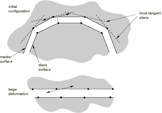Choosing the master and slave surfaces in small-sliding problemsThe basic guidelines given in About contact pairs in Abaqus/Standard should still be followed in a small-sliding simulation—the slave surface should be the more refined surface or the surface on the more deformable body. However, in a small-sliding simulation more thought must be given when defining the master surface. With small-sliding contact each slave node views the master surface as a flat surface, which can be significantly different than the true shape of the surface, even in the local region near the anchor point. In some cases the local tangent planes provide a good local approximation to the master surface in the initial configuration, but deformation and rotation of the master surface can reorient the local tangent planes such that they become a poor representation of the master surface. Figure 15 shows an example where distortion of the master surface results in such a situation. Figure 15. Master surface deformation in a small-sliding contact analysis can
