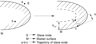 Input File Usage CONTACT PAIR, HCRIT= Abaqus/CAE Usage You cannot adjust the default value of in Abaqus/CAE. Difficulties interpreting the results of contact simulationsAlthough an analysis involving contact runs to completion, the results may seem unrealistic. This is sometimes due to modeling errors and sometimes due to the specialized output format of certain contact formulations. In addition to degrading contact output, the factors discussed below also tend to degrade convergence behavior, so avoiding these factors may improve convergence behavior. Oscillating contact pressures when using second-order elements in “hard” contact simulationsNonuniform contact pressure distributions are likely to occur when very different mesh densities are used on the two deformable surfaces making up a contact interaction. The nonuniformity can be particularly pronounced when “hard” contact is modeled and both surfaces are modeled with second-order elements, including modified, second-order tetrahedral elements. In such cases oscillations and “spikes” in the contact pressure may occur. Smoother contact pressures may be obtained for surfaces modeled with second-order elements by using penalty-type contact constraint enforcement (see Contact constraint enforcement methods in Abaqus/Standard). Inaccurate contact stresses when using second-order axisymmetric elements at the symmetry axisFor second-order axisymmetric elements the contact area is zero at a node lying on the symmetry axis . To avoid numerical singularity problems caused by a zero contact area, Abaqus/Standard calculates the contact area as if the node were a small distance from the symmetry axis. This may result in inaccurate local contact stresses calculated for nodes located on the symmetry axis. Self-contactContact of a surface with itself (self-contact) is provided for cases in which the original geometry is very different from the (deformed) geometry at which contact takes place. It would then be difficult for you to predict which parts of the surface will come into contact with each other. Where possible, it is always computationally more economical to declare parts of the surface as master and parts as slave. The same unpredictability makes it impossible to determine a priori which side will be the master and which side the slave. Therefore, Abaqus/Standard uses a symmetric contact model: every single node of the surface can be a slave node and can simultaneously belong to master segments with respect to all other nodes. Because each surface is acting as both a slave and a master, the results of symmetric contact analyses can be confusing and inconsistent. These difficulties are discussed more fully in Using symmetric master-slave contact pairs to improve contact modeling. Overconstraining the modelThe term overconstraint refers to a situation in which multiple kinematic constraints outnumber the degrees of freedom on which they act. Overconstraints often lead to inaccurate solutions or failure to obtain a converged solution. Contact conditions strictly enforced with the direct constraint enforcement method (using Lagrange multipliers) are sometimes involved in overconstraints. See Overconstraint Checks for a detailed discussion and examples of overconstraints and how Abaqus/Standard will treat overconstraints based on the following classifications: