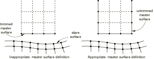 ![]() If viewed with the default plotting options in Abaqus/CAE, this surface will appear to be a valid, continuous surface; however, if this surface is used as the master surface for finite-sliding, node-to-surface contact, a slave node sliding along the surface may fall through this crack and get “stuck” behind the master surface. Similar problems can occur for finite-sliding, surface-to-surface contact. Typically, convergence problems will result that may cause Abaqus/Standard to terminate the analysis. Use the edge display options in the Visualization module of Abaqus/CAE to identify any unwanted cracks in the surfaces used in the model. The cracks will appear as extra perimeter lines in the interior of the surface. Duplicate nodes can be avoided easily by equivalencing nodes when creating the model in a preprocessor. Avoiding problems with contact along the perimeters of surfacesWhen modeling finite-sliding contact, ensure that the master surface definition extends far enough to account for all expected motions of the contacting parts. Contact along the perimeter of master surfaces should be avoided with the node-to-surface contact formulation.. Abaqus/Standard assumes that the mating slave surface nodes can fall off the free edge of the master surface, which can cause problems if a slave node wraps around and approaches its mating master surface from behind. Figure 3 illustrates appropriate and inappropriate master surface definitions. Figure 3. Example of master surface extension.
