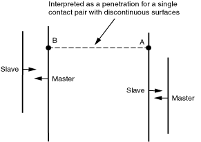 Once you identify the location of an unintended initial overclosure, limiting the display in the Visualization module of Abaqus/CAE to the master and slave surfaces of the interaction involved in the initial overclosure is helpful for identifying the cause of an unintended initial overclosure (see Managing display groups for a discussion of the display group options). Viewing the surface normals (see Displaying element and surface normals) may help determine whether unintended overclosures are due to incorrect surface normals. Overclosures on discontinuous surfacesFigure 1 shows an example with a large, unintended initial overclosure. In this case a single contact pair with discontinuous surfaces is meant to enforce contact in two distinct regions (Table 1Orientation considerations for shell-like surfaces shows which contact formulations allow discontinuous surfaces). The arrows in Figure 1 show the positive normal direction for each surface region. The surface-to-surface contact formulation searches along the slave-surface normal direction (in the positive and negative directions) for potential interaction points on the master surface. The search emanating from point A identifies point B as the only potential interaction point for point A in this example. The contact pair interprets this as a valid penetration because no better candidate interaction location is found and surface normals are opposed at points A and B. Methods to avoid this unintended overclosure include: