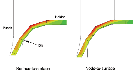 ![]() The differences in computed penetrations can sometimes fundamentally affect the results of an analysis. Be aware of this possibility when converting models from one contact formulation to another. Various aspects of preexisting models, such as the friction coefficient or the pressure-overclosure relationship, may have been inadvertently tuned to the behavior that occurs with a particular contact formulation. Figure 9. Comparison of contact discretizations in an example with a relatively