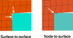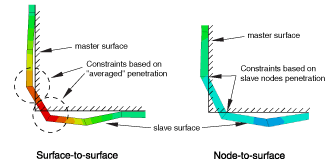 Contact at cornersThe finite-sliding, surface-to-surface formulation is often better-suited than other contact formulations for modeling contact near corners. In the example shown in Figure 11, the slave surface is on the “outer” body (i.e., the body with a reentrant corner). With node-to-surface discretization a single constraint acts at the corner slave node in the “average” normal direction of the master surface, which often leads to poor resolution of contact, non-physical response, and even early termination of an analysis. However, surface-to-surface discretization generates two constraints near the corner for the respective faces, as shown in Figure 11, resulting in more stable contact behavior. Figure 11. Comparison of contact formulations in an example with abutting
